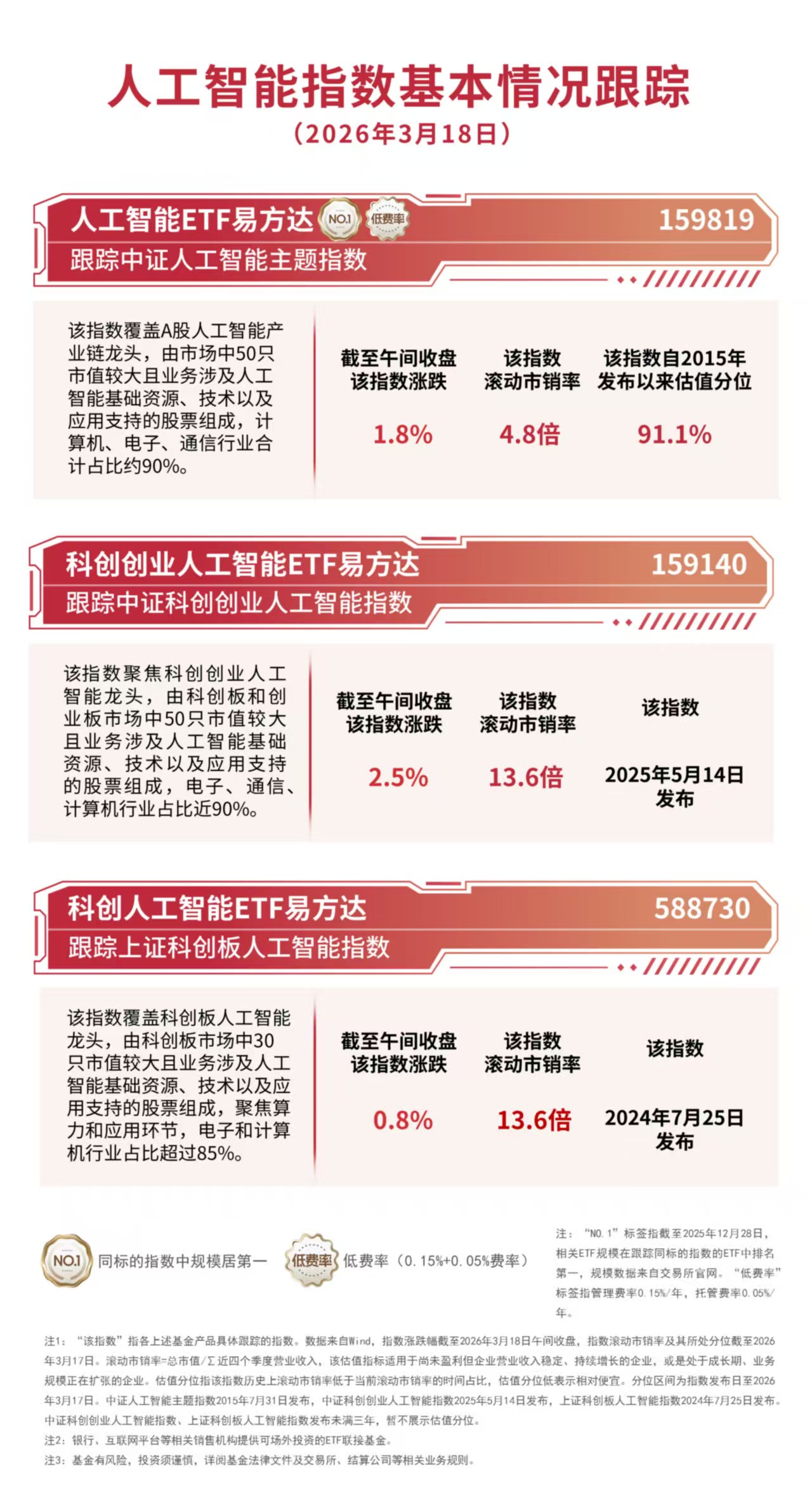 截至收盘,上证科创板人工智能指数下跌2.6%,中证人工智能主题指数下跌2.7%,中证科创创业人工智能指数下跌3.0%。相关ETF中,人工智能ETF易方达(159819,联接基金A/C:012733/012734)和科创创业人工智能ETF易方达(159140)全天分别获1200万份和2600万份净申购。
