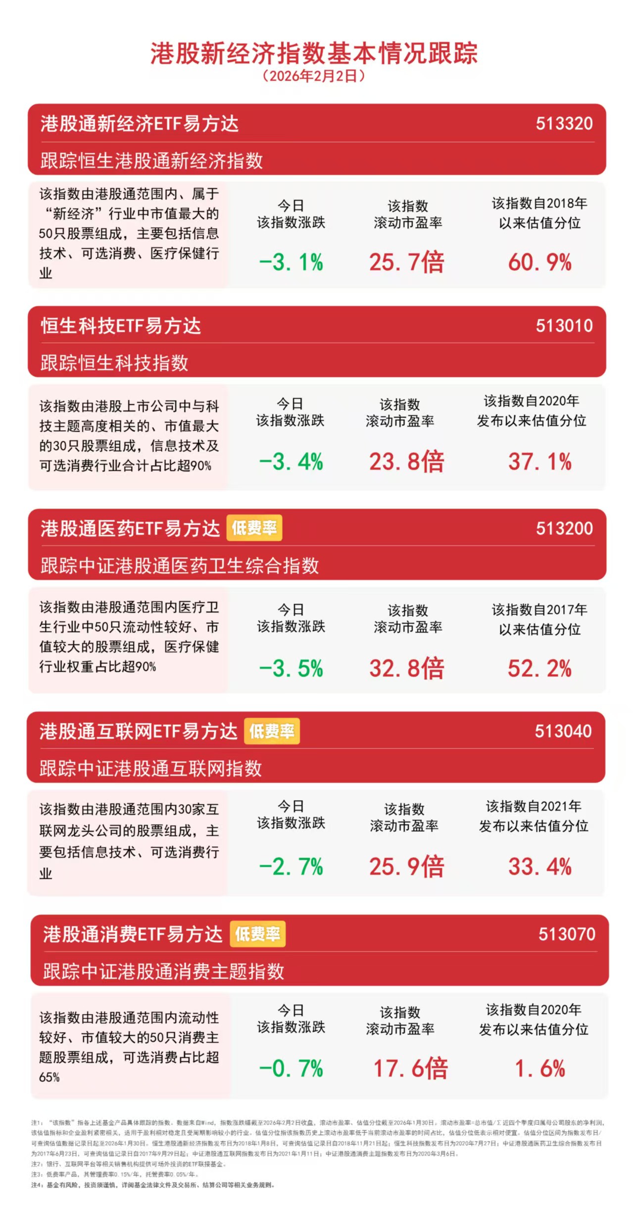 截至收盘,中证港股通消费主题指数下跌0.7%,中证港股通互联网指数下跌2.7%,恒生港股通新经济指数下跌3.1%,恒生科技指数下跌3.4%,中证港股通医药卫生综合指数下跌3.5%。