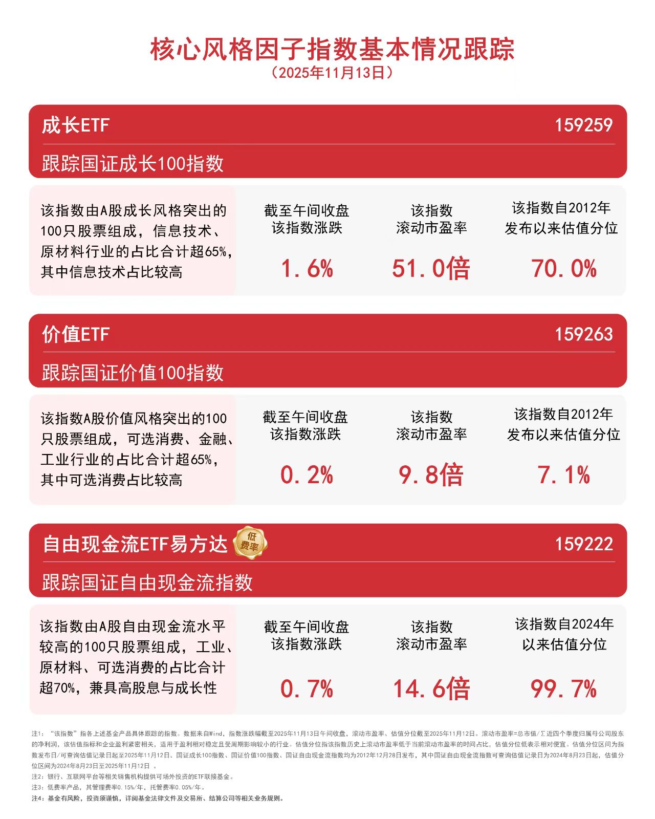 国证成长100指数聚焦A股成长风格突出的股票,紧扣经济转型脉搏,电子、通信、计算机等高景气赛道占比高;国证自由现金流指数则采用自由现金流率进行选样,兼具高股息与成长性。成长ETF(159259)和自由现金流ETF易方达(159222)分别跟踪以上指数,可助力投资者把握相关风格投资机遇。