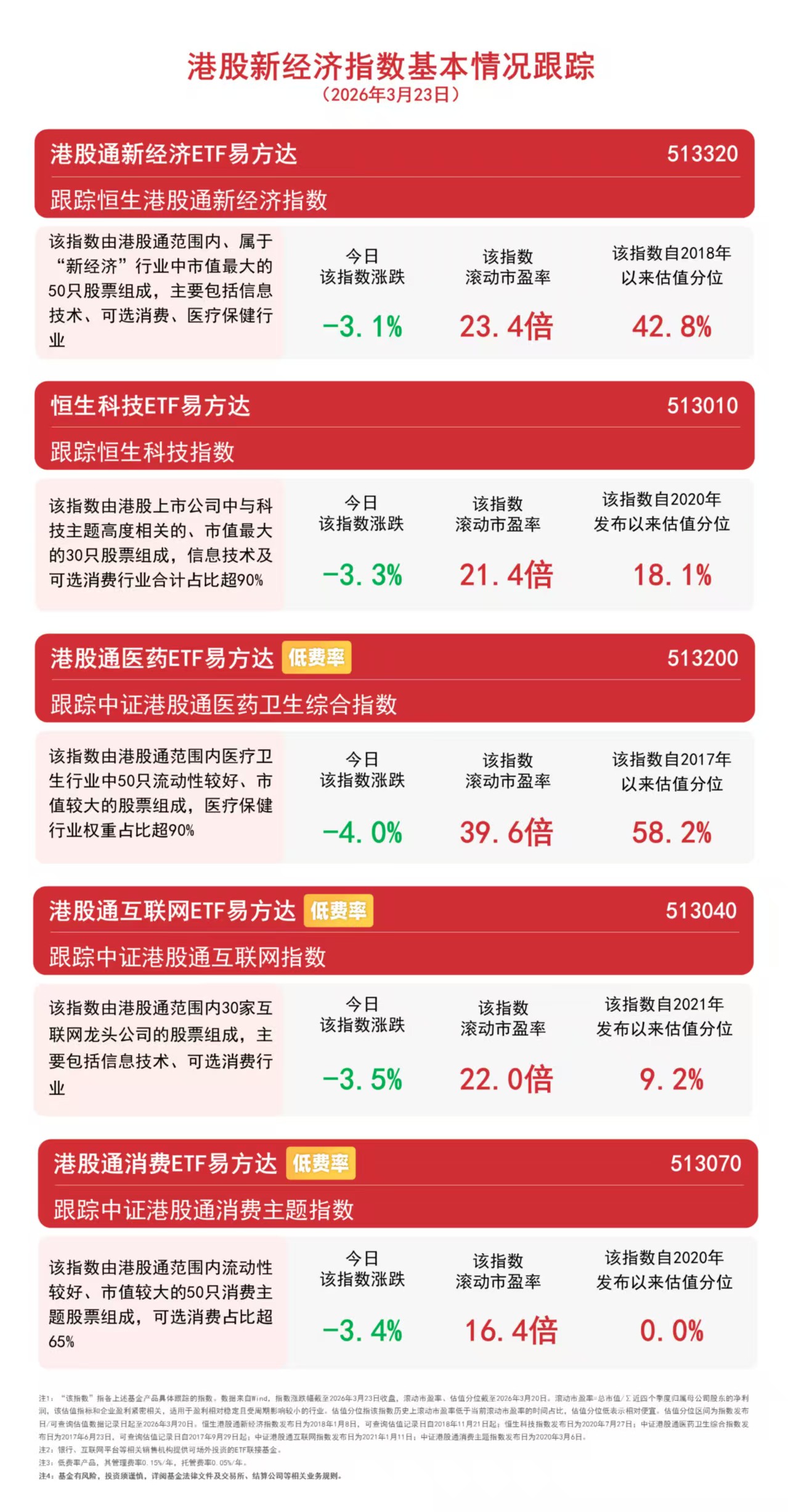 3月23日,港股全线回调,医药、科技、消费板块集体下挫。截至收盘,恒生港股通新经济指数下跌3.1%,恒生科技指数下跌3.3%,中证港股通消费主题指数下跌3.4%,中证港股通互联网指数下跌3.5%,中证港股通医药卫生综合指数下跌4.0%。