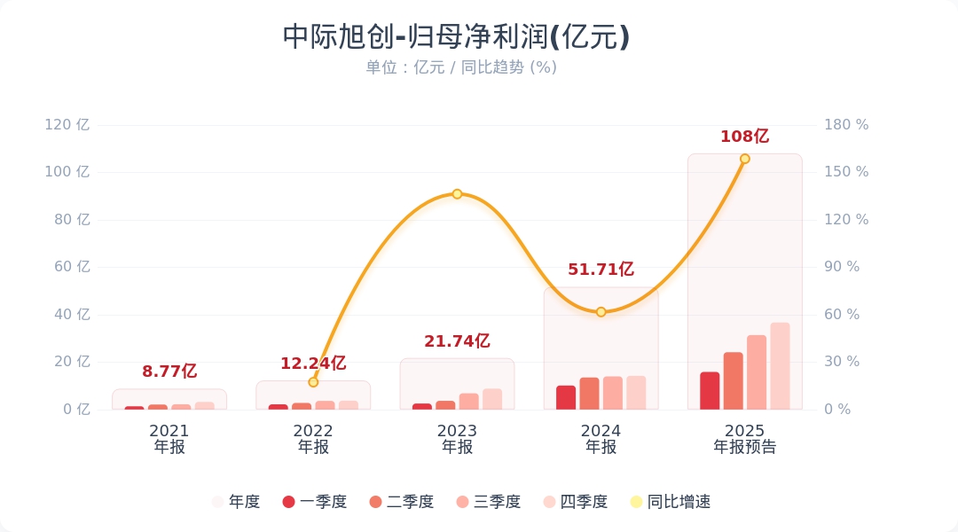 财联社1月30日电,中际旭创(300308.SZ)公告称,预计2025年归属于上市公司股东的净利润为98亿元-118亿元,比上年同期增长89.50%-128.17%。报告期内,受益于终端客户对算力基础设施的强劲投入,公司产品出货较快增长,其中高速光模块占比持续提高,且随着产品方案不断优化、运营效率继续提升,公司营业收入与净利润均较去年同期实现较大增长。小财注:中际旭创2025年Q3净利31.37亿元,据此计算,2025年Q4净利润预计26.68亿-46.68亿,环比变动-14%至48%。第四季度净利润分析师一致预测是32.24亿。