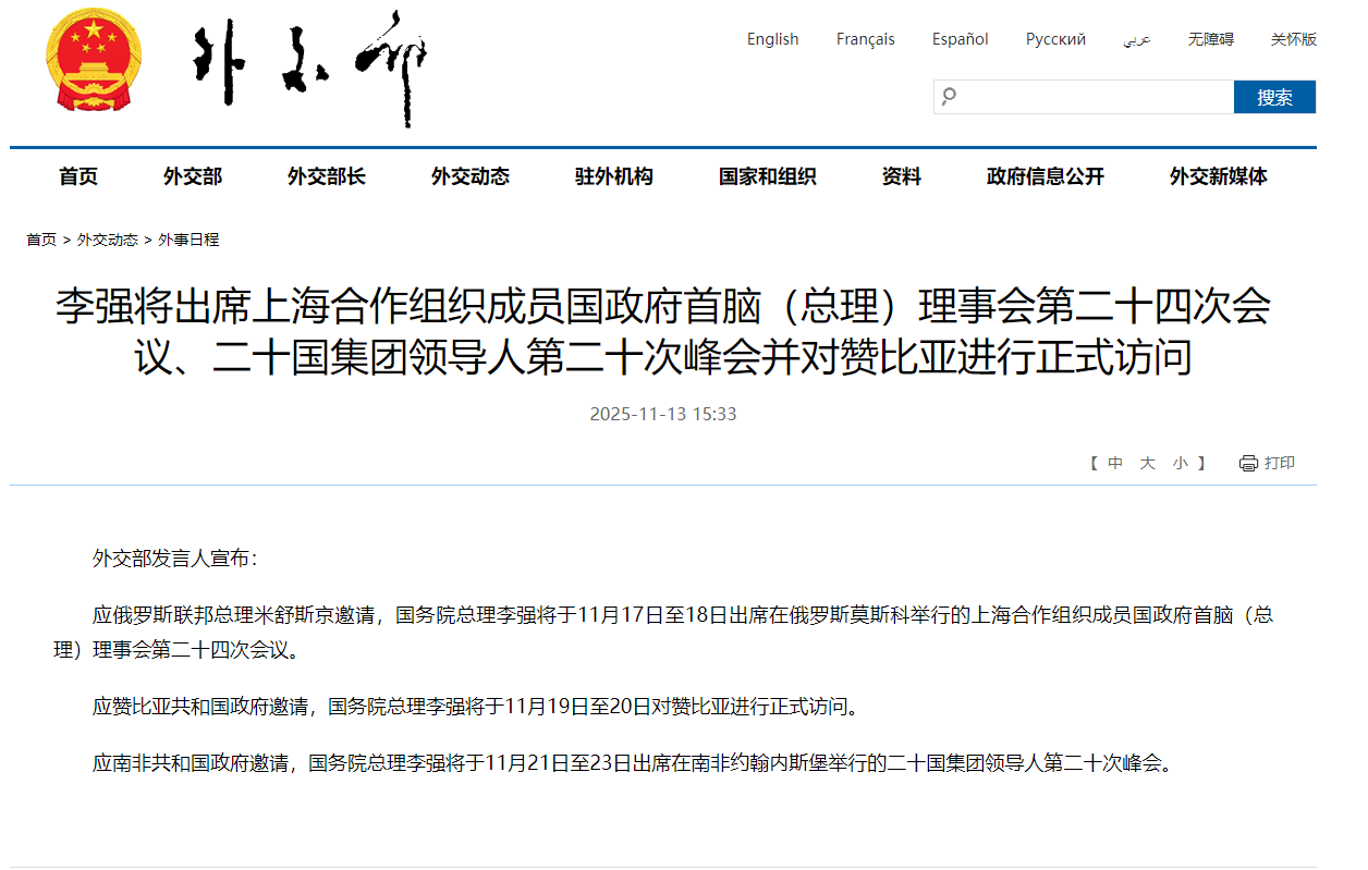 应赞比亚共和国政府邀请,国务院总理李强将于11月19日至20日对赞比亚进行正式访问。