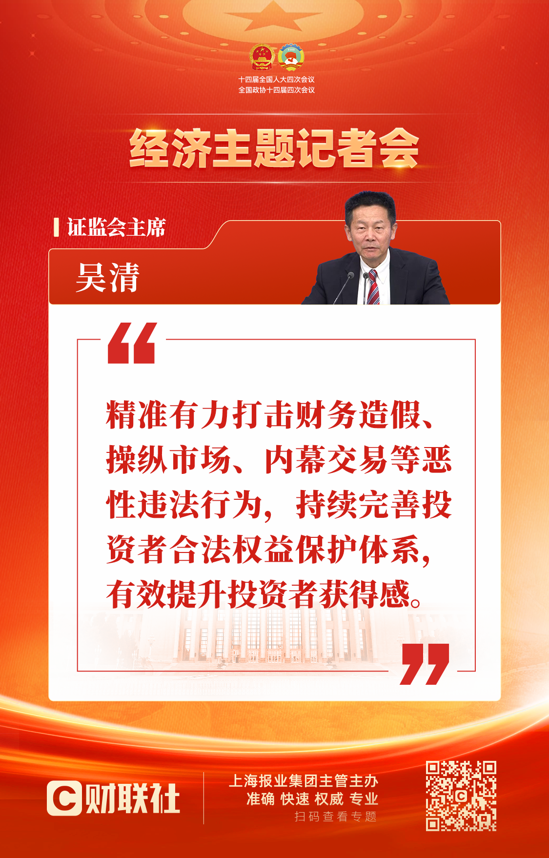 财联社3月6日电,在十四届全国人大四次会议经济主题记者会上,证监会主席吴清表示,精准有力打击财务造假、操纵市场、内幕交易等恶性违法行为,持续完善投资者合法权益保护体系,有效提升投资者获得感。