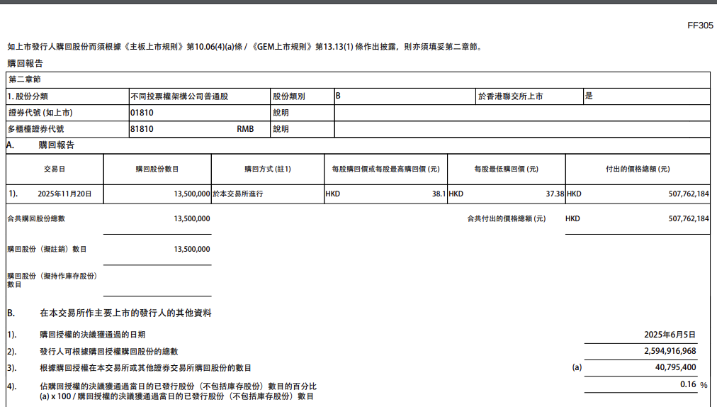 小米集团今日斥资超5亿港元回购股份 规模为近期最大