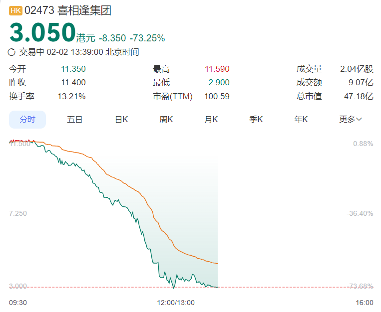 喜相逢集团大跌7成 成交9亿港元创上市以来新高