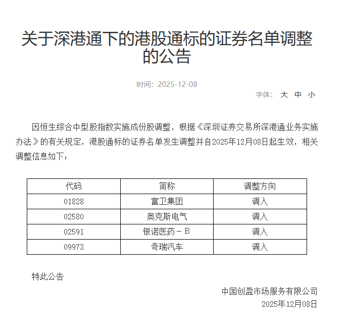 财联社12月8日电,深交所发布公告,因恒生综合中型股指数实施成份股调整,根据《深圳证券交易所深港通业务实施办法》的有关规定,富卫集团、奥克斯电气、银诺医药-B、奇瑞汽车调入港股通标的证券名单,调整自2025年12月08日起生效。
