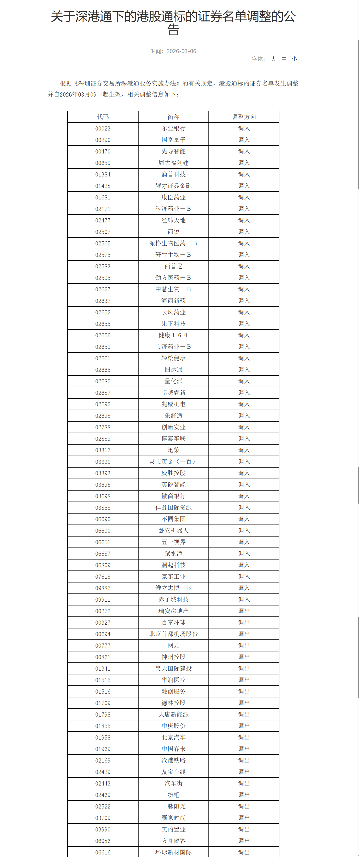 财联社3月6日电,根据《深圳证券交易所深港通业务实施办法》的有关规定,港股通标的证券名单发生调整并自2026年03月09日起生效。其中,调入先导智能、滴普科技、耀才证券金融、京东工业等,调出北京首都机场股份、神州控股、北京汽车、美的置业等。