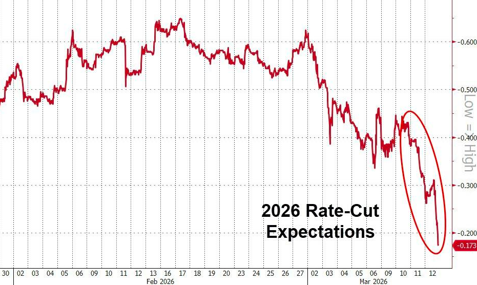 财联社3月13日电,过去几天,交易员们已迅速放弃了对美联储将在初夏放宽货币政策的期望。这种想法的转变,正值美国-以色列袭击伊朗以及油价飙升至每桶100美元左右之际。FedWatch的最新概率显示,联邦基金期货市场的交易员目前已经基本排除了9月份降息的可能性,现在认为美联储可能只会在12月份降息一次。而与美联储政策会议日期挂钩的利率掉期合约则显示,掉期交易员第一次不再百分百确信美联储今年会降息。掉期交易员隔夜一度仅预期美联储今年只会降息17个基点——已不足一次25个基点的降息幅度。而周三晚些时候的交易中这一预期还曾约为40个基点。这种前景能否维持,可能取决于中东局势的发展。如果紧张局势缓和好转,市场可能会恢复常态,并重新点燃更多宽松政策的希望。但若霍尔木兹海峡的航运持续中断,飙升的油价显然可能会拉高全球利率。
