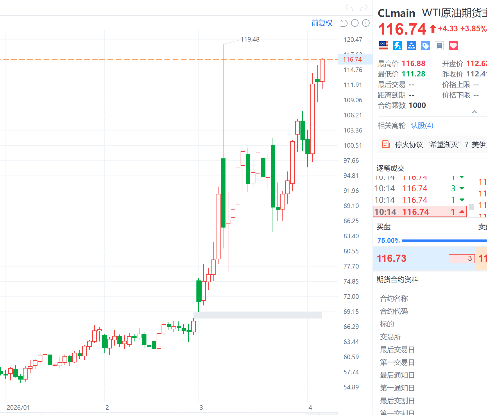 财联社4月7日电,国际油价持续拉高,WTI原油期货涨4%,报116.871美元/桶;布伦特原油期货涨1.05%,报110.928美元/桶。据伊朗方面7日消息,该国已关闭与美国的所有外交和间接沟通渠道。