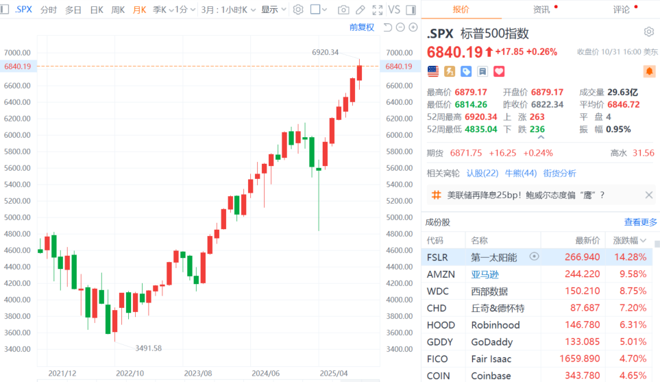 财联社10月31日电,在亚马逊和苹果的助攻下,美股三大指数开盘集体上涨,道琼斯指数涨0.06%,标普500指数涨0.72%,纳斯达克综合指数涨1.53%。亚马逊股价开盘大涨12.2%,市值骤增近3000亿美元,达到2.66万亿美元,其云计算部门(AWS)第三季度营收增长20%,超出华尔街预期。苹果股价上涨约2%,受iPhone 17热销的提振,该公司最新季报超预期,并预计下财季将继续保持强劲。