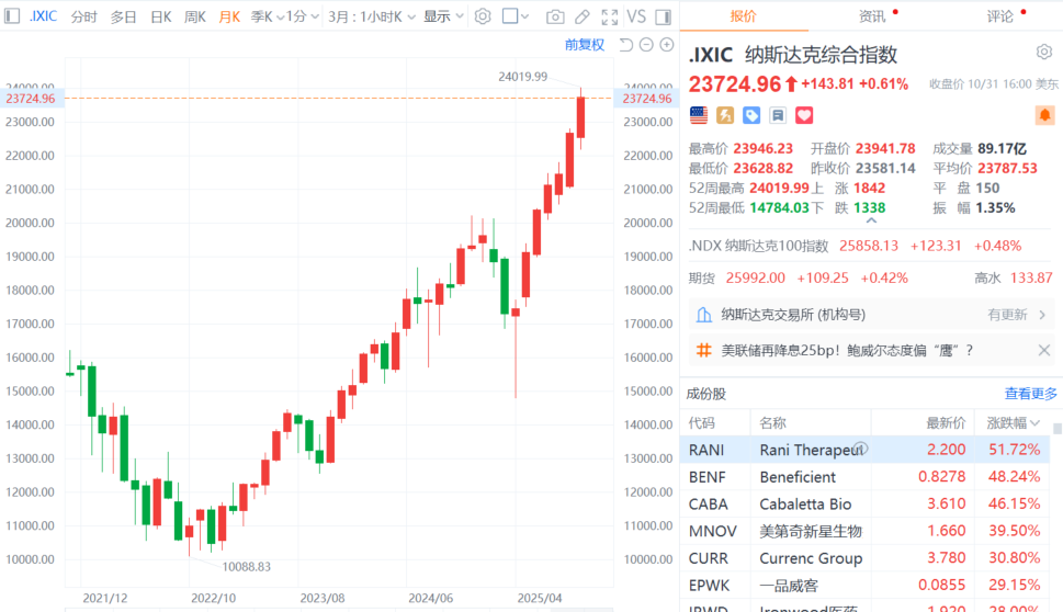 财联社11月1日电,美股三大指数集体收涨,纳指涨0.61%,本周累涨2.24%,10月份累涨4.7%;标普500指数涨0.26%,本周累涨0.71%,10月累涨2.27%;道指涨0.09%,本周累涨0.75%,10月累涨2.51%。其中,纳指月线7连涨,道指、标普500指数月线6连涨。亚马逊大涨超9%,创历史新高;特斯拉涨超4%,奈飞涨逾2%;Meta跌超2%,微软跌超1%,英特尔、苹果、英伟达、谷歌小幅下跌。Illumina Inc.涨超24%,创2012年1月份以来最大单日涨幅。