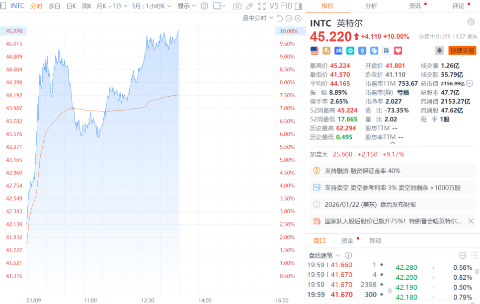财联社1月10日电,英特尔日内涨幅扩大至10%,报45.22美元/股,创2024年3月以来新高。