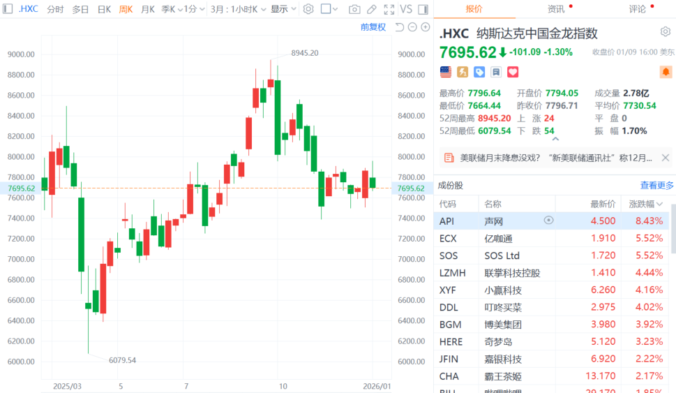 热门中概股涨跌不一 纳斯达克中国金龙指数跌1.3%