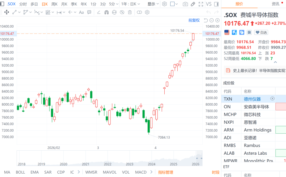 财联社4月23日电,受德州仪器强劲财报提振,半导体公司股价周四上涨,延续了创纪录的连涨势头。费城证券交易所半导体指数上涨2.7%,有望实现连续第17个交易日上涨,进一步巩固了其史上最长的连涨纪录。在此轮上涨中,该指数涨幅已超过40%。德州仪器在公布财报及强劲预测后股价飙升17%。