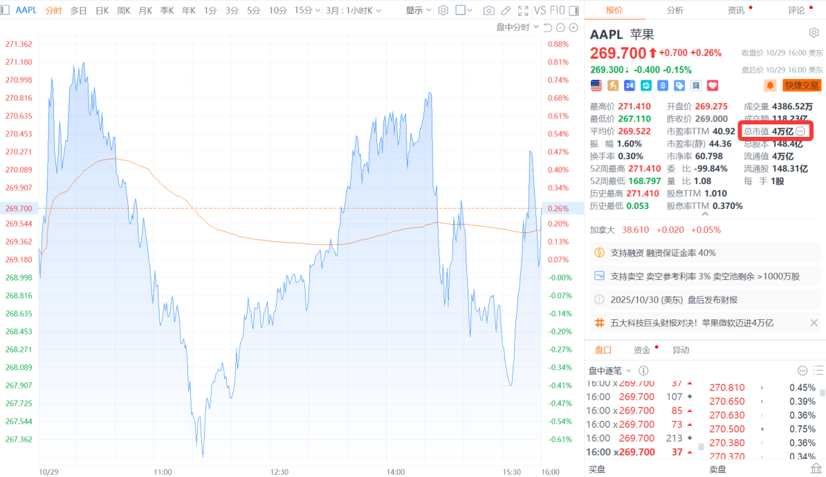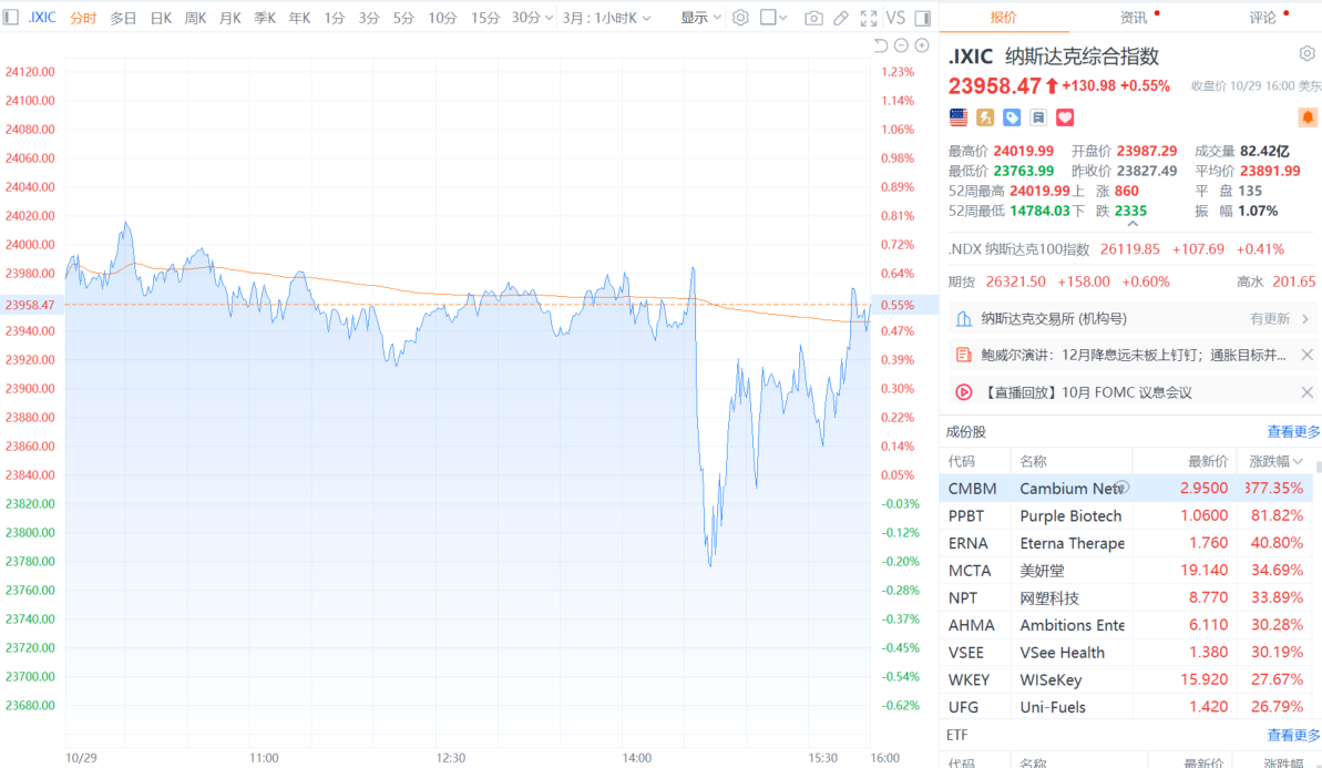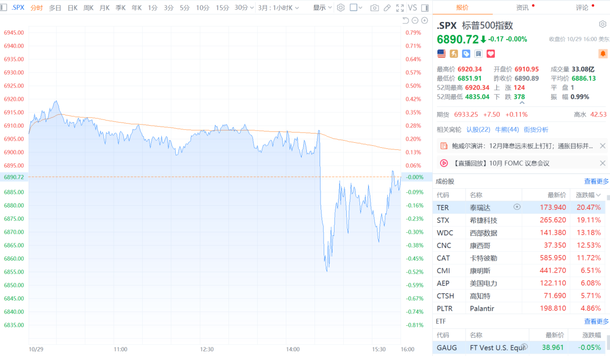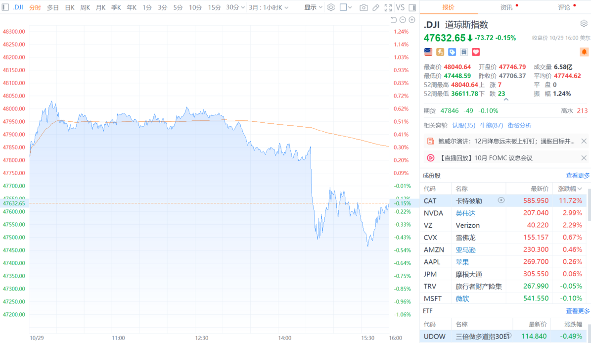 财联社10月30日电,美联储连续第二次降息25个基点并宣布12月开始停止QT,鲍威尔称12月可能暂停降息。美股三大指数收盘涨跌不一,纳指涨0.55%,标普500指数平收,道指跌0.16%。英伟达涨约3%,总市值站上5万亿美元大关。苹果小幅上涨,首次收盘总市值超4万亿美元。谷歌涨超2%,续创新高;亚马逊、Meta、特斯拉小幅上涨;英特尔、微软、奈飞小幅下跌。卡特彼勒涨12%,创2009年以来最大单日涨幅。
