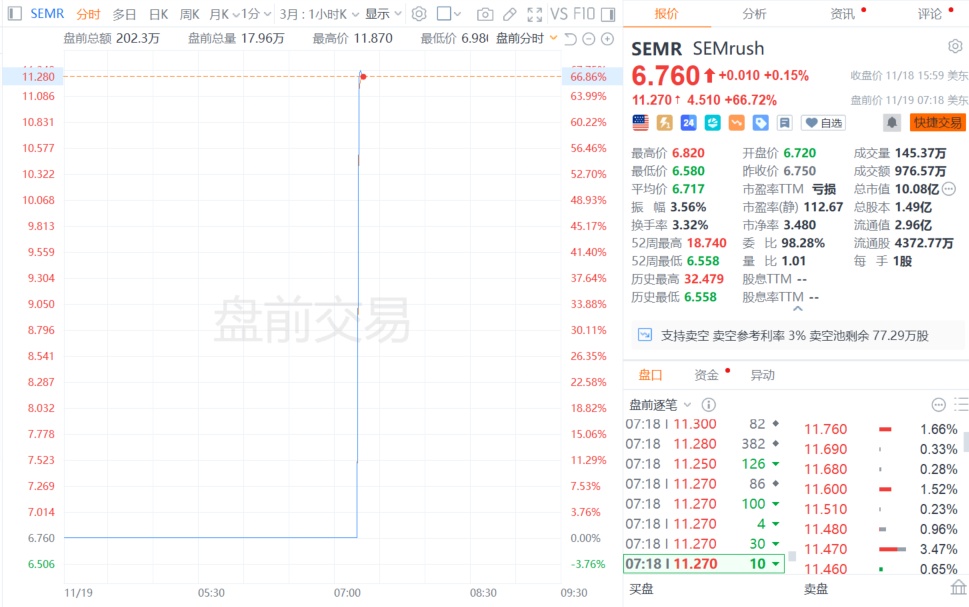 搜索引擎营销公司Semrush股价盘前涨超66%