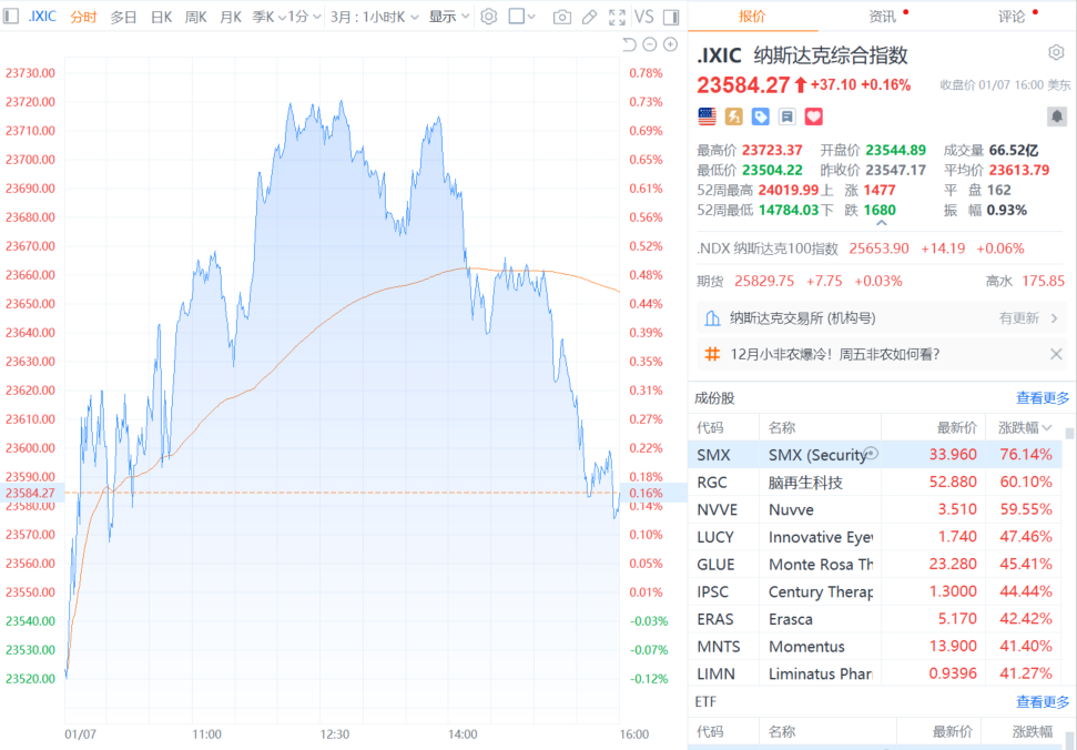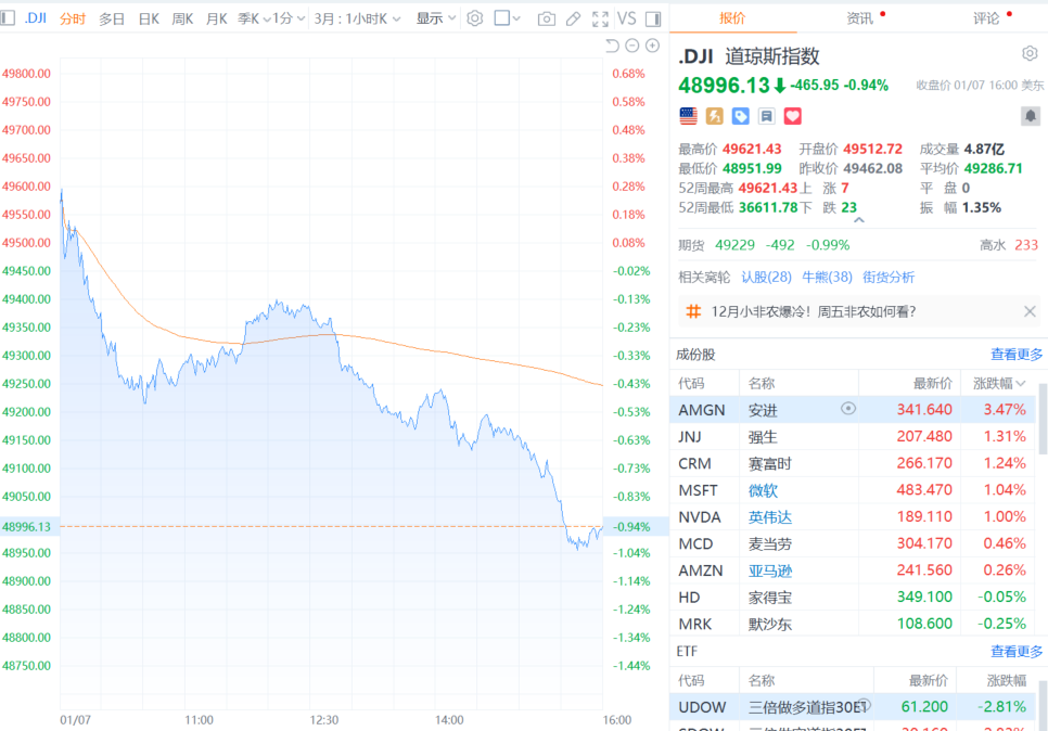 财联社1月8日电,美股三大指数收盘涨跌不一,纳指涨0.16%,标普500指数跌0.34%,道指跌0.94%。大型科技股多数上涨,英特尔涨超6%,谷歌涨逾2%,微软、英伟达涨超1%,亚马逊小幅上涨;Meta跌逾1%,苹果、特斯拉小幅下跌。其中,谷歌市值达到3.89万亿美元,超过苹果公司的3.85万亿美元,为2019年以来首次。国防军工股NORTHROP GRUMMAN股价收跌超5%,洛克希德马丁跌近5%,此前特朗普向国防承包商回购股票的做法发出威胁。黑石跌超5%,特朗普称,将在达沃斯演讲中讨论住房问题,将禁止大型投资者购买独栋住宅。