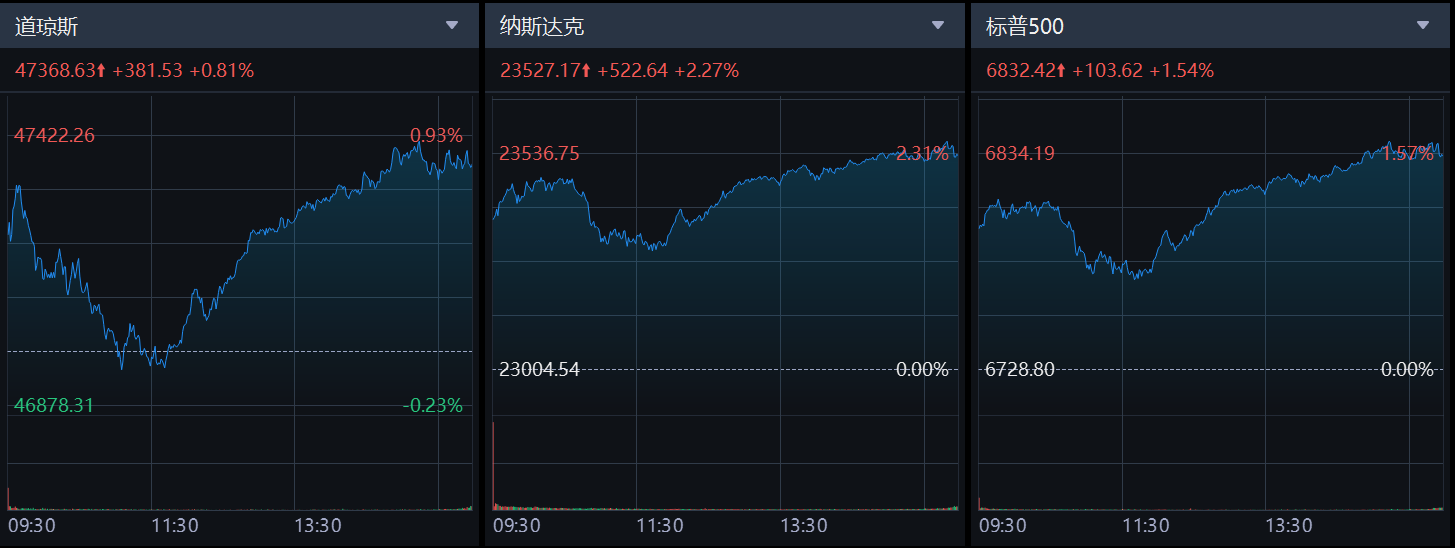 财联社11月11日电,纳指涨幅扩大至2.2%,道琼斯指数涨0.64%,标普500指数涨1.41%。