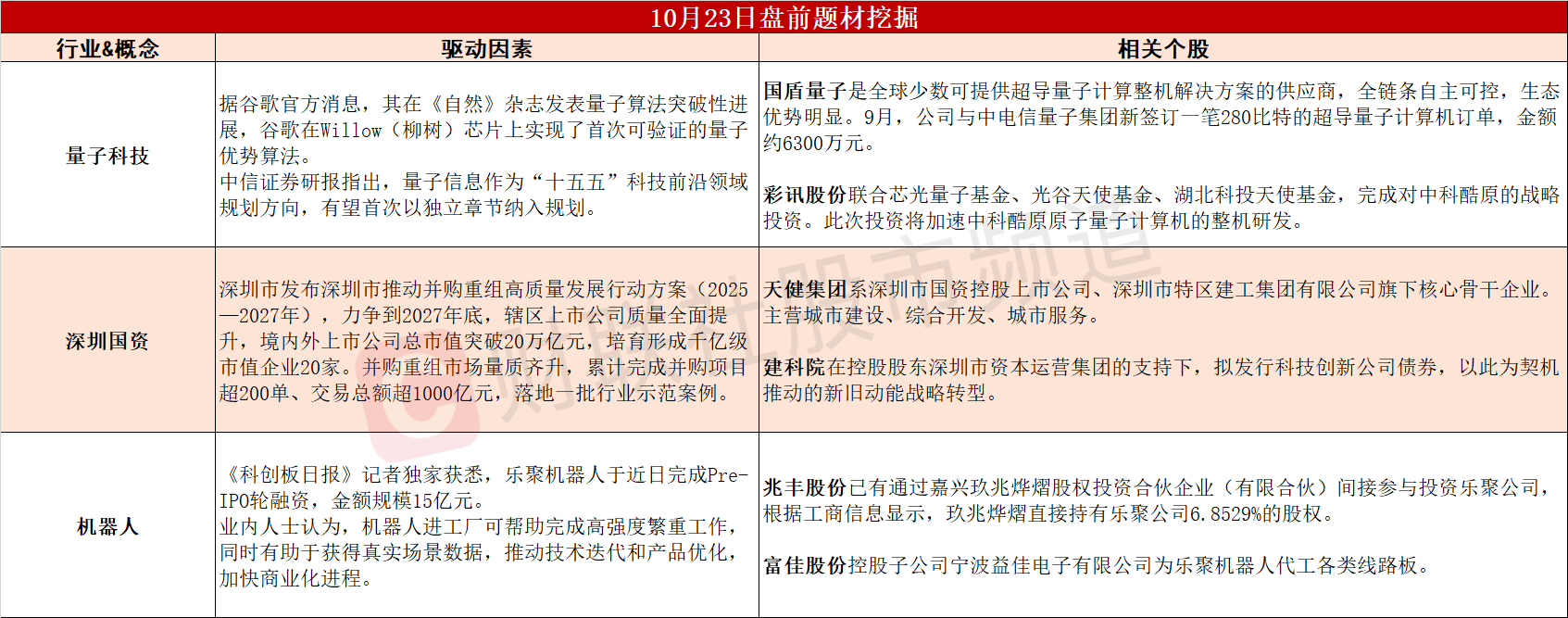 ①谷歌Willow芯片实现量子计算突破,量子科技应用拐点有望提前到来。②深圳发布推动并购重组高质量发展行动方案,深圳国资板块有望站上风口。③乐聚机器人完成15亿融资,相关生态链投资机遇凸显。