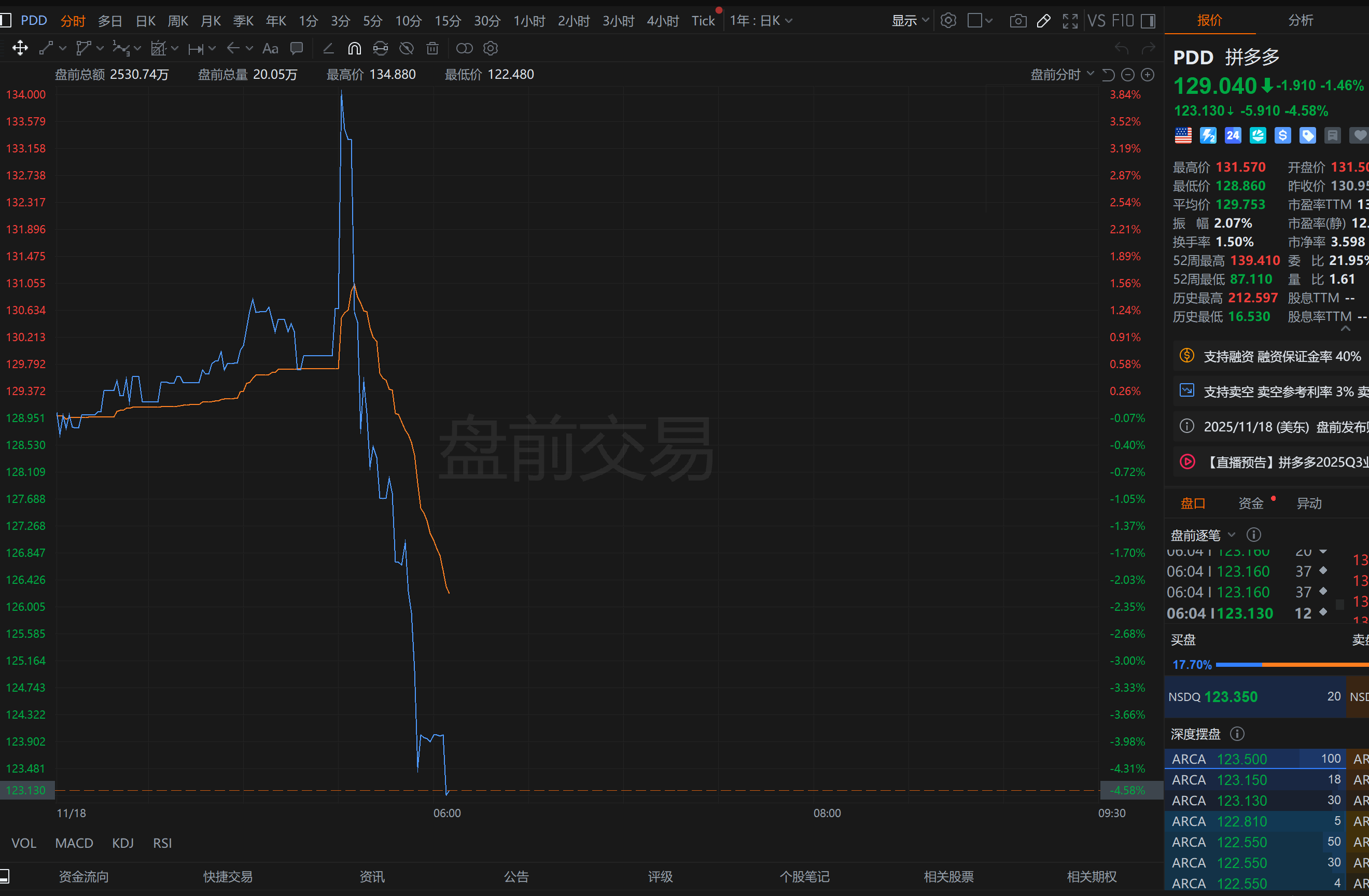 财联社11月18日电,拼多多ADRS抹去前期涨幅,盘前跌0.4%,此前一度涨近4%。