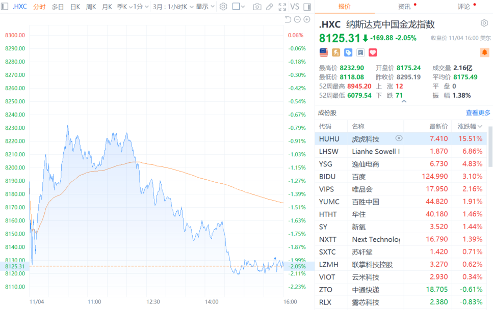 财联社10月31日电,纳斯达克中国金龙指数收跌1.88%,明星中概股多数下跌。哔哩哔哩跌超5%,网易跌超4%,阿里巴巴跌超3%,京东跌近3%;新东方涨近4%。