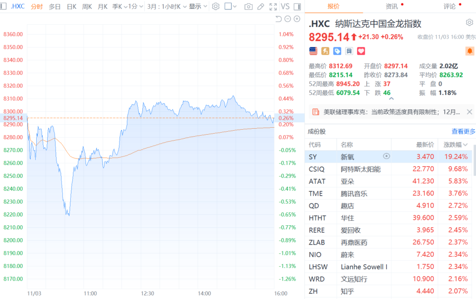 财联社10月25日电,纳斯达克中国金龙指数收涨0.27%,本周累涨2.4%。文远知行涨超5%,金山云涨超2%,百度、哔哩哔哩涨近2%;爱奇艺跌近1%。