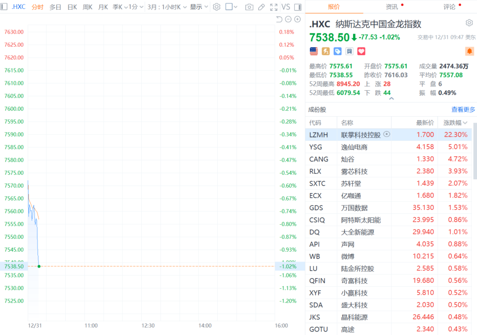 财联社12月31日电,纳斯达克中国金龙指数日内跌幅扩大至1%。