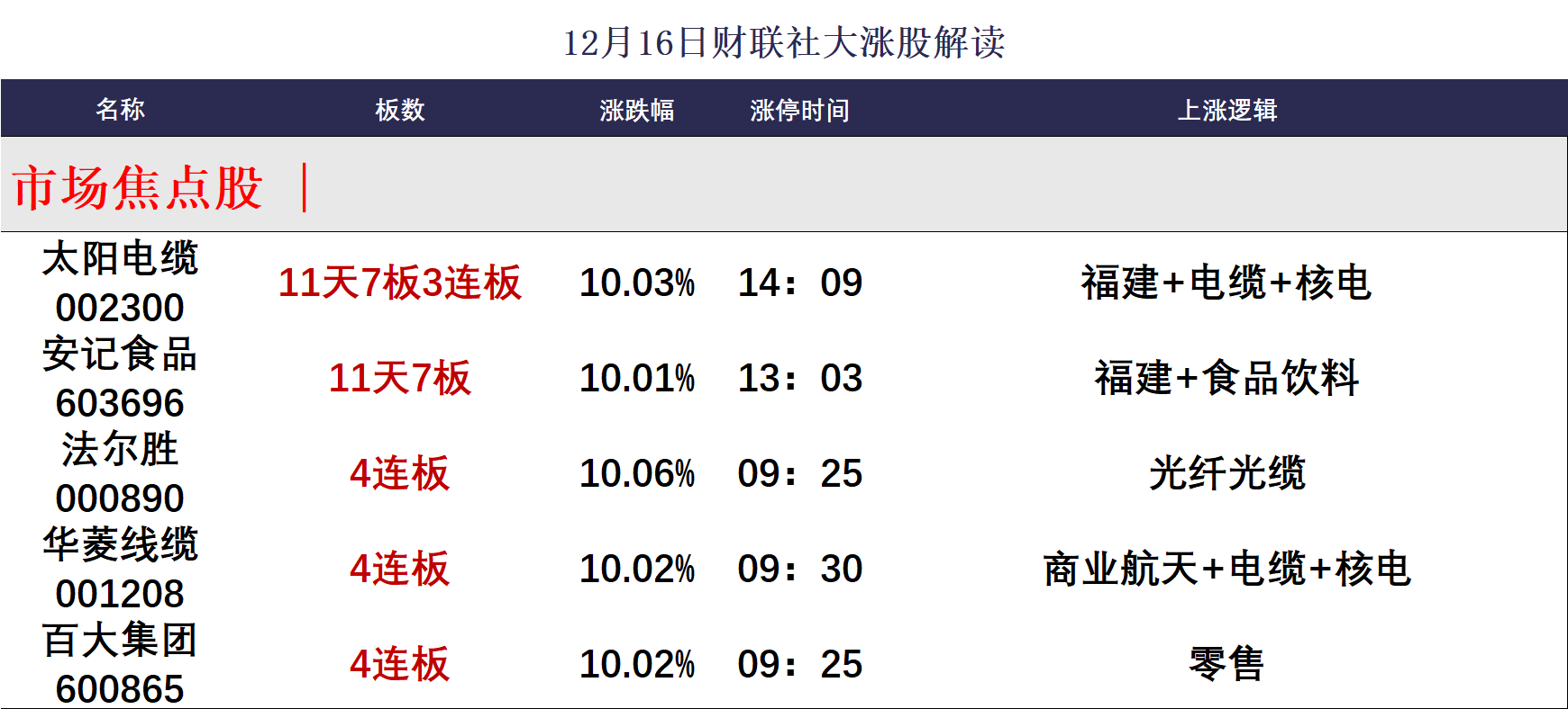 财联社12月16日电,今日全市场共42股涨停,连板股总数13只,19股封板未遂,封板率为69%(不含ST股、退市股)。焦点股方面,线缆概念股太阳电缆11天7板、法尔胜4连板、华菱线缆4连板,泛消费板块安记食品11天7板、百大集团4连板。