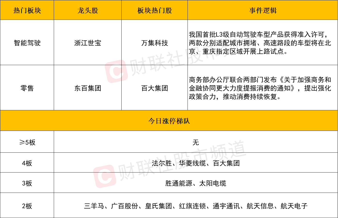 今日共42股涨停,连板股总数13只,其中三连板及以上个股5只,上一交易日共13只连板股,连板股晋级率38.46%(不含ST股、退市股)。个股方面,全市场超4300只个股下跌,龙洲股份一字跌停拖累短线情绪,博纳影业、国机重装等个股跌停。个股炒作进一步“缩圈”,少数几只高位股获资金抱团,平潭发展一度涨超7%再创阶段新高,太阳电缆走出11天7板,但值得注意的是,人气热股航天发展尾盘炸板。板块方面,以零售为代表的大消费板块延续反弹,百大集团4连板,红旗连锁、广百股份2连板,欧亚集团、利群股份等涨停;智能驾驶概念股爆发,北交所汉鑫科技30CM涨停,万集科技20CM涨停,北汽蓝谷、路畅科技、浙江世宝等个股涨停,消息面上,我国首批L3级自动驾驶车型产品获得准入许可,两款分别适配城市拥堵、高速路段的车型将在北京、重庆指定区域开展上路试点。