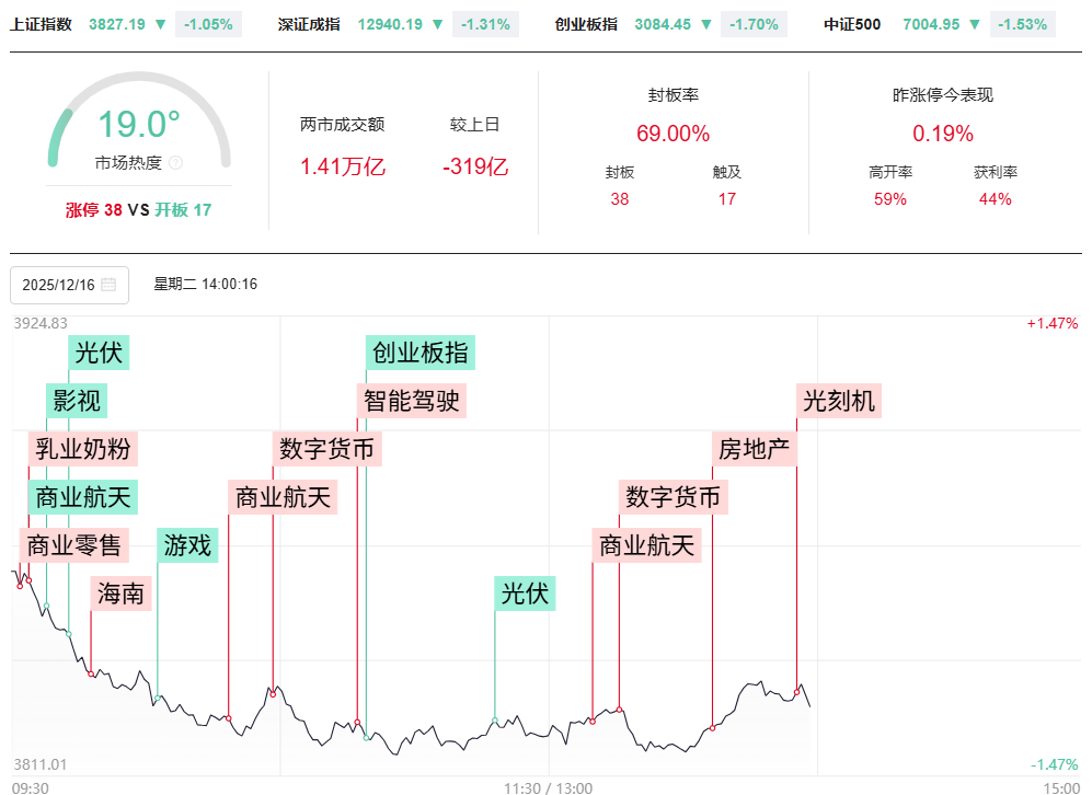 财联社12月16日电,市场全天震荡调整,三大指数集体低开低走。沪深两市成交额1.72万亿,较上一个交易日缩量493亿。全市场超4300只个股下跌。从板块来看,互金板块走强,恒宝股份等多股涨停,创识科技触及20cm涨停。商业航天反复活跃,华菱线缆4连板,航天电子、通宇通讯2连板。零售概念全天强势,百大集团4连板,红旗连锁、广百股份双双2连板。智能驾驶概念逆势拉升,浙江世宝、索菱股份等股涨停。下跌方面,影视院线概念集体大跌,博纳影业2连跌停。板块方面,零售、教育、乳业、多元金融等板块涨幅居前,贵金属、影视院线等板块跌幅居前。截至收盘,沪指跌1.11%,深成指跌1.51%,创业板指跌2.1%。
