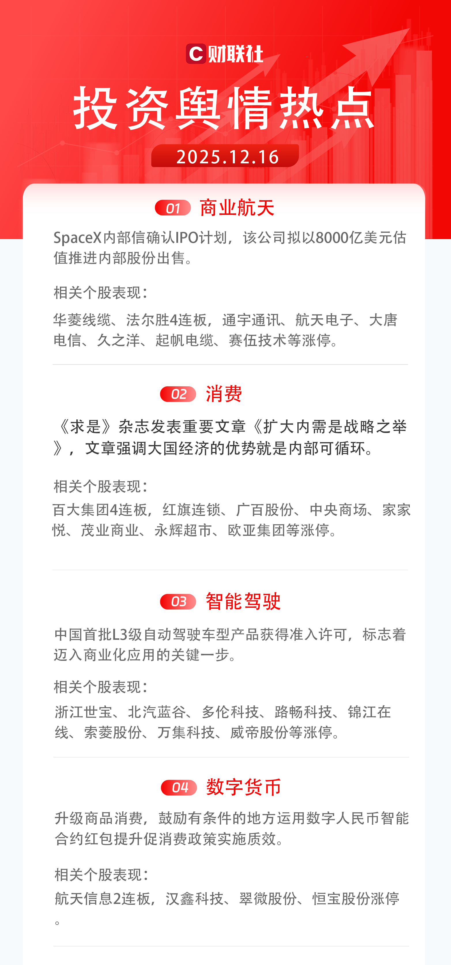财联社12月16日电,午后商业航天概念再度拉升,天力复合涨近25%,7个交易日累计上涨超200%,此前华菱线缆、通宇通讯、大唐电信涨停,久之洋、瑞华泰、天银机电均涨超10%。