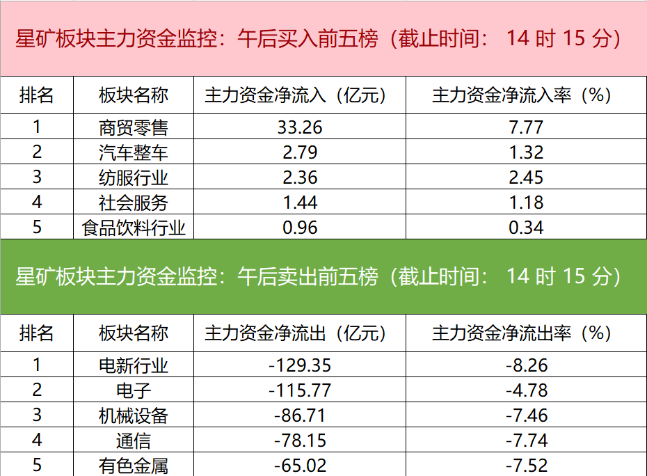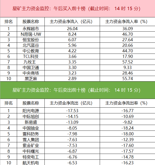 财联社12月16日电,财联社星矿数据显示,今日主力资金净流入商贸零售、汽车整车、纺服行业等板块,净流出电新行业、电子、机械设备等板块,其中电新行业净流出超129亿元。个股方面,永辉超市资金净买入26.04亿元位居首位,N昂瑞-UW、恒宝股份、北汽蓝谷主力资金净流入居前;阳光电源遭净卖出超17亿元位居首位,中际旭创、新易盛、中国铀业主力资金净流出额居前。