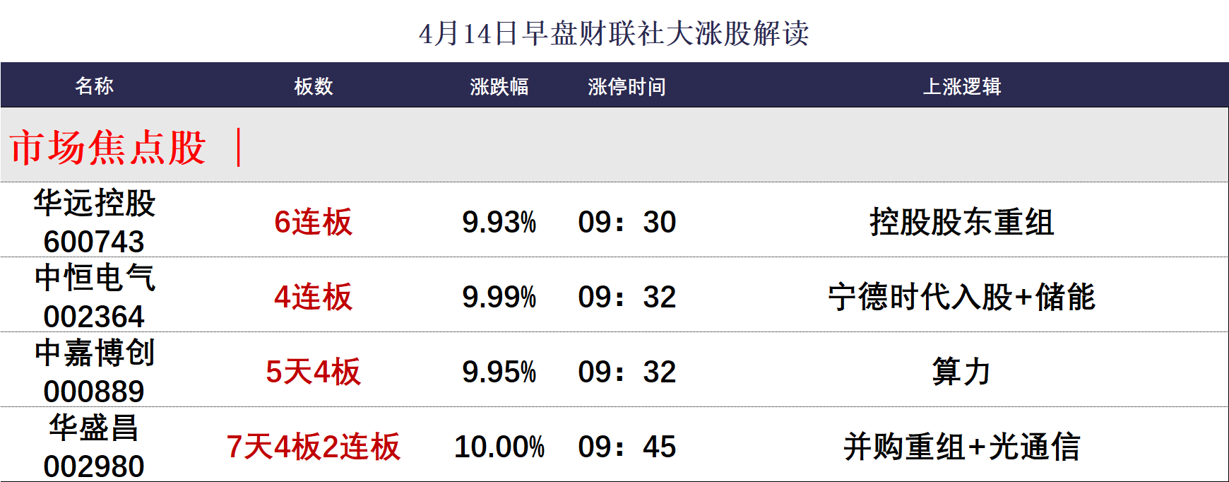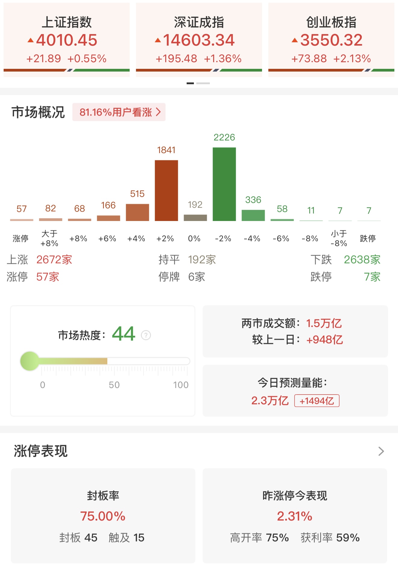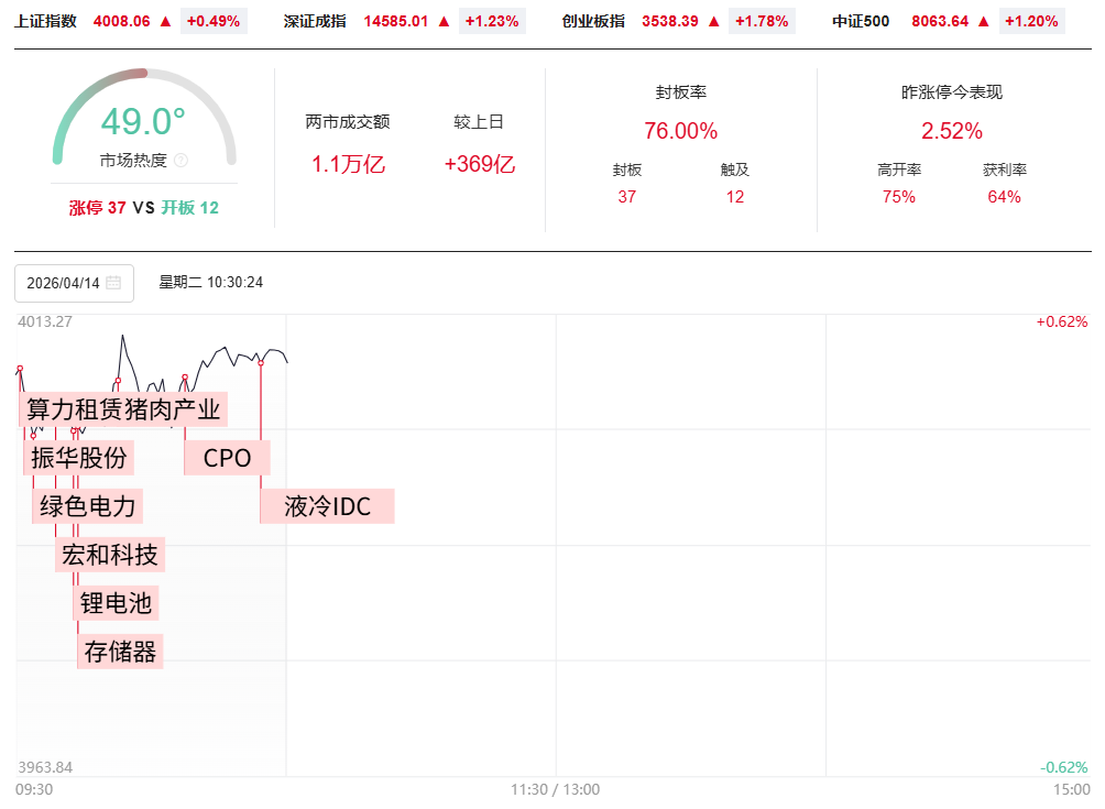 财联社4月14日电,创业板指涨超2%,续创阶段新高,深成指均涨超1%。黄白线明显分化,权重股走势较强。沪深两市半日成交额1.5万亿,较上个交易日放量948亿。盘面上热点快速轮动,全市场近2700只个股上涨。从板块来看,算力产业链反复走强,其中PCB概念爆发,沪电股份、宏昌电子、宏和科技、大族激光涨停,创历史新高。存储芯片概念持续拉升,江波龙、佰维存储、大为股份大涨创历史新高。算力租赁概念集体走强,中嘉博创5天4板,协创数据20CM涨停。CPO概念表现活跃,长光华芯、中际旭创续创历史新高。下跌方面,油气股集体调整,潜能恒信、通源石油、科力股份均下挫。截至收盘,沪指涨0.55%,深成指涨1.36%,创业板指涨2.13%。