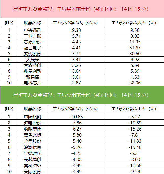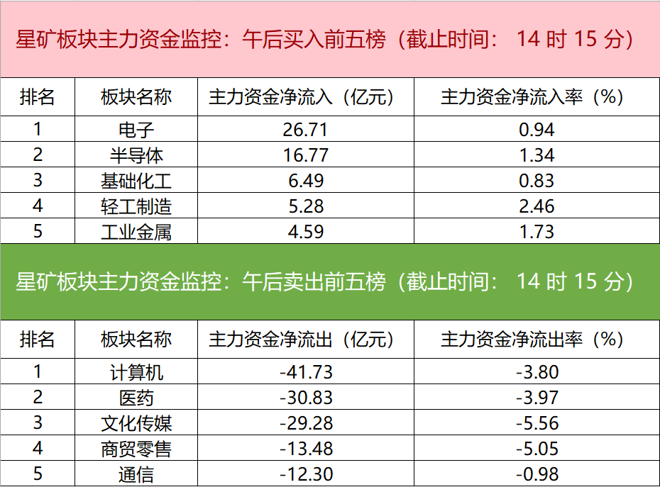财联社11月27日电,财联社星矿数据显示,今日主力资金净流入电子、半导体、基础化工等板块,净流出计算机、医药、文化传媒等板块,其中计算机板块净流出超41亿元。个股方面,中兴通讯主力资金净买入9.38亿元位居首位,工业富联、芯原股份、福日电子主力资金净流入居前;中际旭创遭净卖出超10亿元位居首位,沪电股份、药明康德、蓝色光标主力资金净流出额居前。