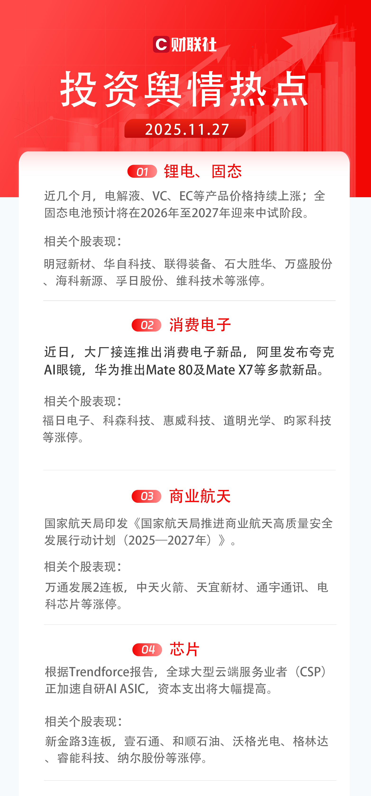 财联社11月27日电,市场冲高回落,三大指数涨跌不一,创业板指、深成指先后翻绿,创业板指此前一度涨超2%。沪深两市成交额1.71万亿,较上一个交易日缩量736亿。盘面上,市场热点快速轮动,全市场超2700只个股上涨。从板块来看,锂电池概念爆发,壹石通20cm涨停,石大胜华涨停,华盛锂电涨超15%。消费电子板块走强,福日电子、科森科技等多股涨停。大消费板块走强,茂业商业3连板,海欣食品、广百股份双双2连板。下跌方面,AI应用概念持续分化,欢瑞世纪、石基信息均跌停。板块方面,有机硅、电池、消费电子等板块涨幅居前,海南、影视院线、AI应用等板块跌幅居前。截至收盘,沪指涨0.29%,深成指跌0.25%,创业板指跌0.44%。