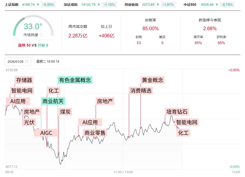 财联社1月20日电,早盘三大指数震荡回落,深成指跌超1%,创业板指一度跌超2%。沪深两市半日成交额1.85万亿,较上个交易日放量568亿。盘面上热点较为杂乱,全市场超3300只个股下跌。从板块来看,化工板块逆势拉升,红宝丽、山东赫达、宏柏新材、维远股份、红墙股份涨停。房地产板块表现活跃,大悦城、我爱我家、城投控股涨停。AI应用端盘中走高,佳云科技、粤传媒、浙文互联、天地在线涨停。存储芯片概念反复活跃,普冉股份、佰维存储再创新高。下跌方面,商业航天概念再度大跌,华菱线缆、航天动力跌停。截至收盘,沪指跌0.3%,深成指跌1.22%,创业板指跌1.83%。