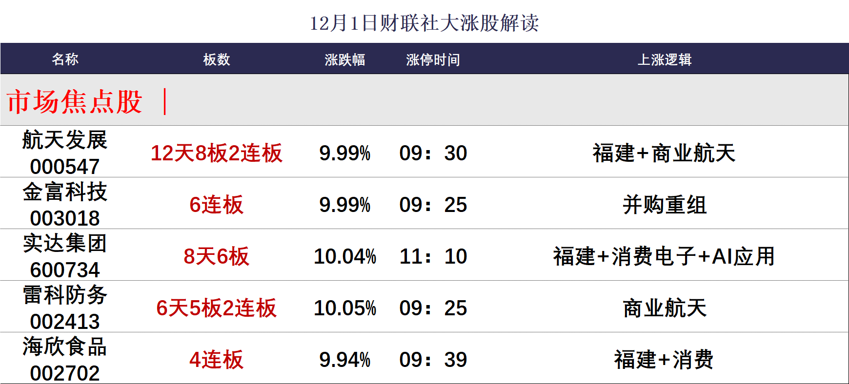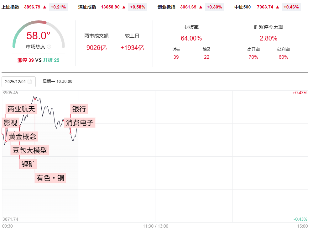 财联社12月1日电,市场早盘震荡拉升,深成指、创业板指盘中均涨超1%,沪指重返3900点上方。沪深两市半日成交额1.23万亿,较上个交易日放量2504亿。盘面上热点快速轮动,全市场超3600只个股上涨。从板块来看,消费电子方向集体大涨,中兴通讯、天音控股、道明光学等10余股涨停。有色金属板块表现活跃,白银有色、闽发铝业涨停。商业航天概念延续强势,航天发展12天8板。下跌方面,风电板块走势较弱,三一重能跌超6%板块方面,消费电子、有色金属等板块涨幅居前,保险、中船系、风电设备等板块跌幅居前。截至收盘,沪指涨0.42%,深成指涨0.95%,创业板指涨0.9%。