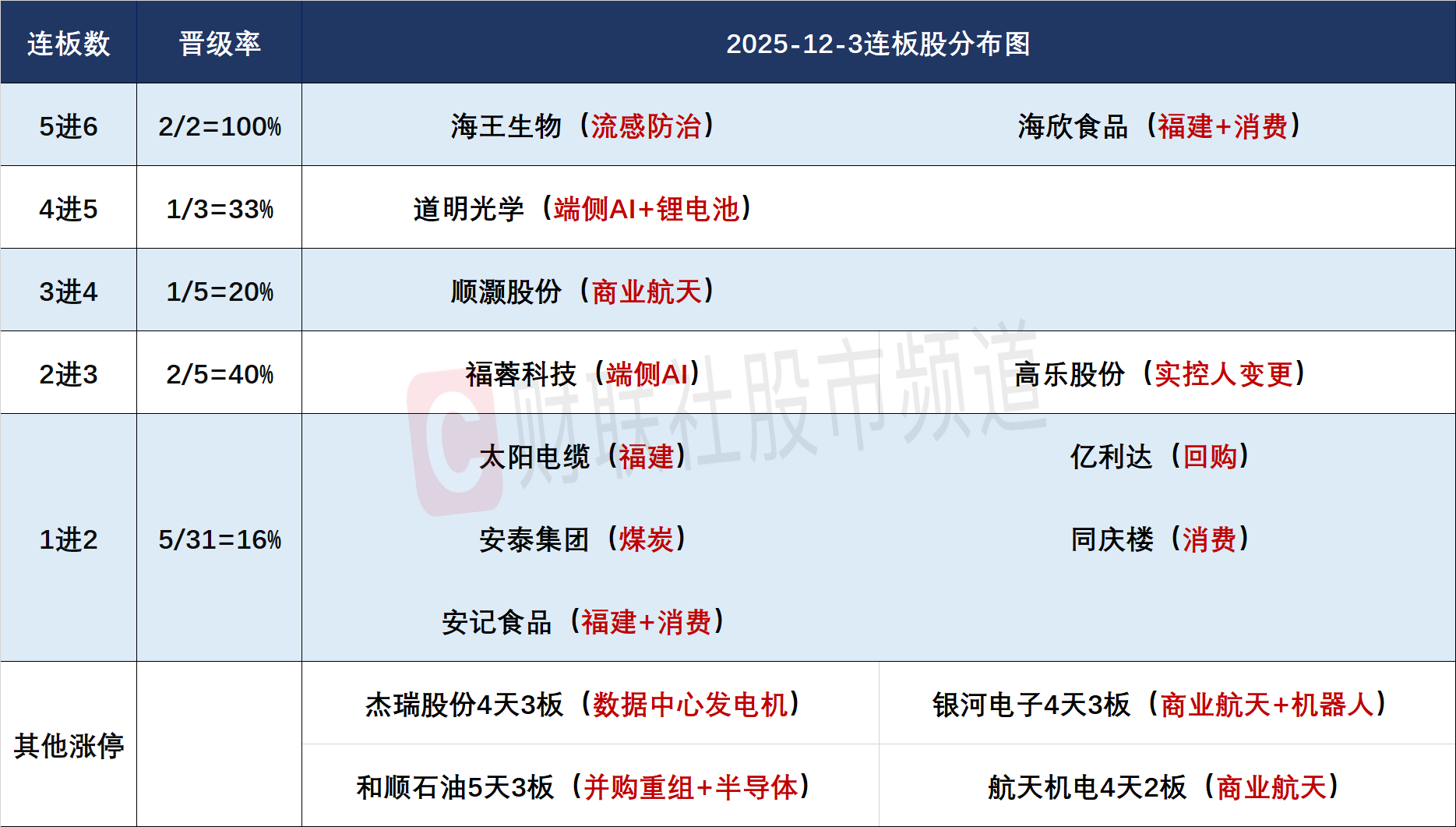 12月3日连板股分析:连板股晋级率37.5% 商业航天概念盘中巨震