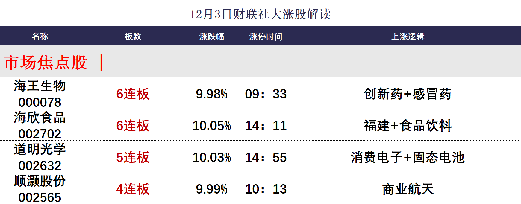 财联社12月3日电,今日午盘全市场共35股涨停,连板股总数9只,22股封板未遂,封板率为61%(不含ST股、退市股)。焦点股方面,流感防治概念股海王生物6连板,福建本地股海欣食品6连板,消费电子板块道明光学5连板,商业航天概念股顺灏股份4连板。
