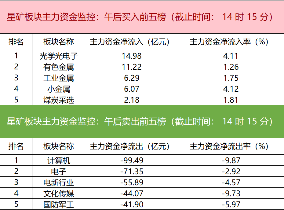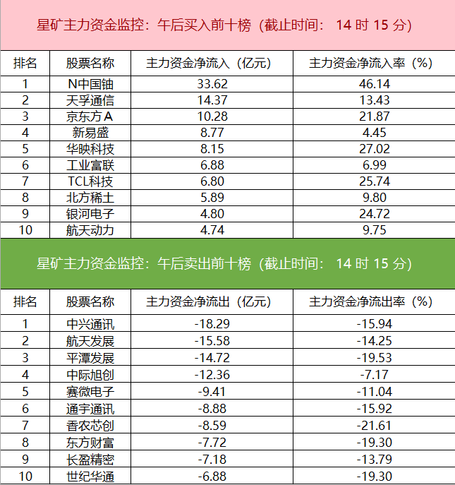 财联社12月3日电,财联社星矿数据显示,今日主力资金净流入光学光电子、有色金属、工业金属等板块,净流出计算机、电子、电新行业等板块,其中计算机板块净流出超99亿元。个股方面,N中国铀主力资金净买入33.62亿元位居首位,天孚通信、京东方A、新易盛主力资金净流入居前;中兴通讯遭净卖出超18亿元位居首位,航天发展、平潭发展、中际旭创主力资金净流出额居前。