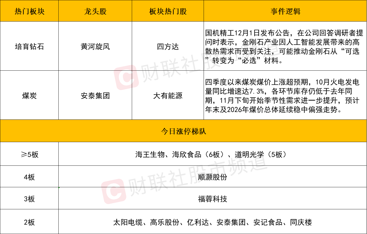 财联社12月3日电,市场全天震荡调整,创业板指跌超1%,早盘一度涨超1%。沪深两市成交额1.67万亿,较上一个交易日放量765亿。全市场超3800只个股下跌。从板块来看,超硬材料概念表现活跃,黄河旋风涨停。煤炭板块走强,安泰集团2连板,大有能源、新大洲A涨停。风电板块拉升,大金重工、德力佳双双涨停。商业航天概念午后冲高,顺灏股份4连板,航天机电4天2板。下跌方面,AI应用概念集体走弱,福石控股、因赛集团大跌。板块方面,培育钻石、煤炭、风电设备等板块涨幅居前,AI应用、锂矿等板块跌幅居前。截至收盘,沪指跌0.51%,深成指跌0.78%,创业板指跌1.12%。