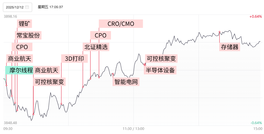 财联社12月15日电,上个交易日市场探底回升,三大指数全线收红,创业板指涨近1%。沪深两市成交额2.09万亿,放量2351亿。1)据报道,中国航天科技集团八院的长征十二号甲运载火箭即将挑战“发射+回收”双目标,近期利好频传对商业航天人气持续形成加强,人气股再升科技、天力复合、华菱线缆、航天动力、顺灏股份实现连板晋级,龙洲股份、航天长峰、泰永长征、超捷股份等实现反包板。2)据券商草根调研,继合肥的BEST项目后,江西“星火一号”与成都“先觉”等多个新项目已确认将于年内启动前期招标。可控核聚变概念展开凌厉补涨,中国核建、国机重装、中洲特材、海陆重工等大批成分股涨停,爱科赛博一度涨超15%创出历史新高。3)OpenAI正式发布GPT-5.2系列模型,迎战谷歌Gemini 3,算力硬件股卷土重来,联特科技一度触及20厘米涨停,德科立、东田微双双创历史新高,长芯博创、赛微电子、仕佳光子均涨超10%。4)燃气轮机巨头GE Vernova上调未来数年业绩指引,刺激燃气轮机概念反复活跃,东方电气、博盈特焊、常宝股份、万泽股份报收涨停,杰瑞股份反包向上续创历史新高。此前遭遇深幅调整的变压器方向也展开补涨,中国西电、保变电气、顺钠股份、中能电气均报收涨停。