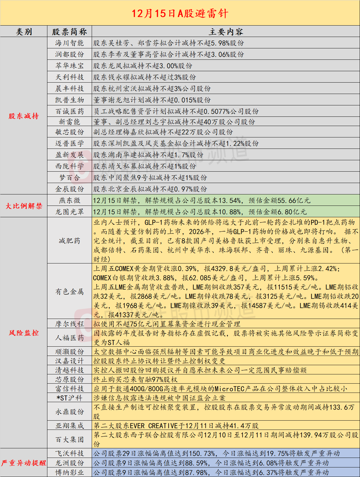 近日公告的A股拟减持的公司数量较之前有所增多,海川智能股东吴桂芳、郑雪芬拟合计减持不超5.98%股份,润都股份股东李希及董事高管拟合计减持不超3.06%股份;燕东微、龙图光罩将迎来超一成以上解禁;业内人士预计司美格鲁肽国内价格战即将打响;摩尔线程拟使用不超75亿元闲置募集资金进行现金管理;万科三个展期议案均未获通过;人福医药因披露的年度报告财务指标存在虚假记载,股票将被实施其他风险警示证券简称变更为ST人福;上周五美股三大指数集体收跌,博通跌超11%。