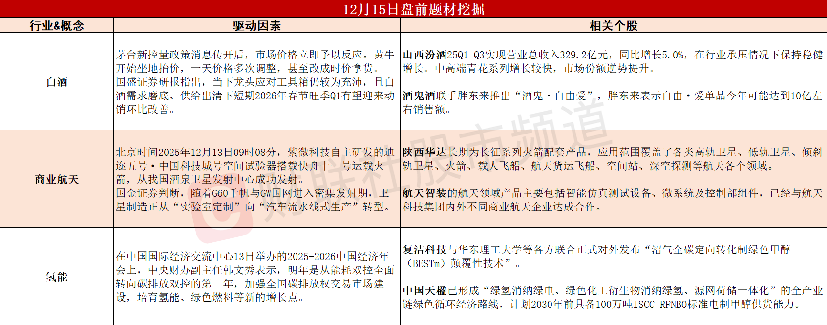 ①黄牛坐地起价!白酒龙头给出积极信号,2026年板块估值修复可期。②民营太空飞船成功升空,我国商业航天发展迈入新阶段。③顶层关注度提升,氢能产业链有望迎来发展大机遇。