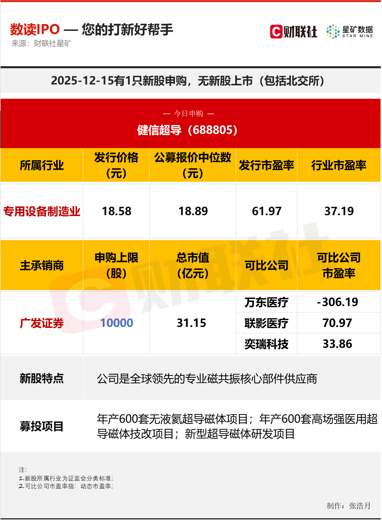 财联社12月15日电,今日有1只新股申购,为科创板的健信超导;无新股上市。健信超导是全球领先的专业磁共振核心部件供应商。