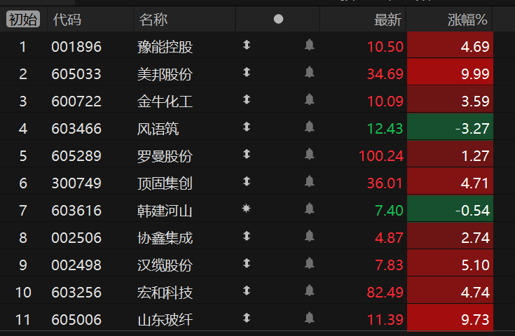 财联社2月25日电,市场焦点股豫能控股(4板)高开4.69%,化工板块美邦股份(4板)竞价涨停、金牛化工(7天4板)高开3.59%,AI应用端的风语筑(6天4板)低开3.27%、罗曼股份(2板)高开1.27%,商业航天概念股顶固集创(创业板6天3板)高开4.71%,并购重组的韩建河山(9天5板)低开0.54%,光伏板块协鑫集成(9天5板)高开2.74%,电网设备板块汉缆股份(3板)高开5.10%,玻纤概念股宏和科技(4天3板)高开4.74%、山东玻纤(4天3板)高开9.73%。