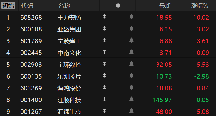 财联社3月11日电,市场焦点股王力安防(5板)竞价涨停,农业股亚盛集团(8天6板)高开3.02%,数据中心机柜出租的宁波建工(3板)高开3.61%,并购重组的中南文化(2板)竞价涨停,机器人概念股宇环数控(2板)高开5.53%,折叠屏概念股乐凯胶片(2板)低开2.98%,液冷服务器概念股海鸥股份(3天2板)高开0.84%、江顺科技(3天2板)低开0.05%,光通信板块汇绿生态(4天2板)高开5.08%。