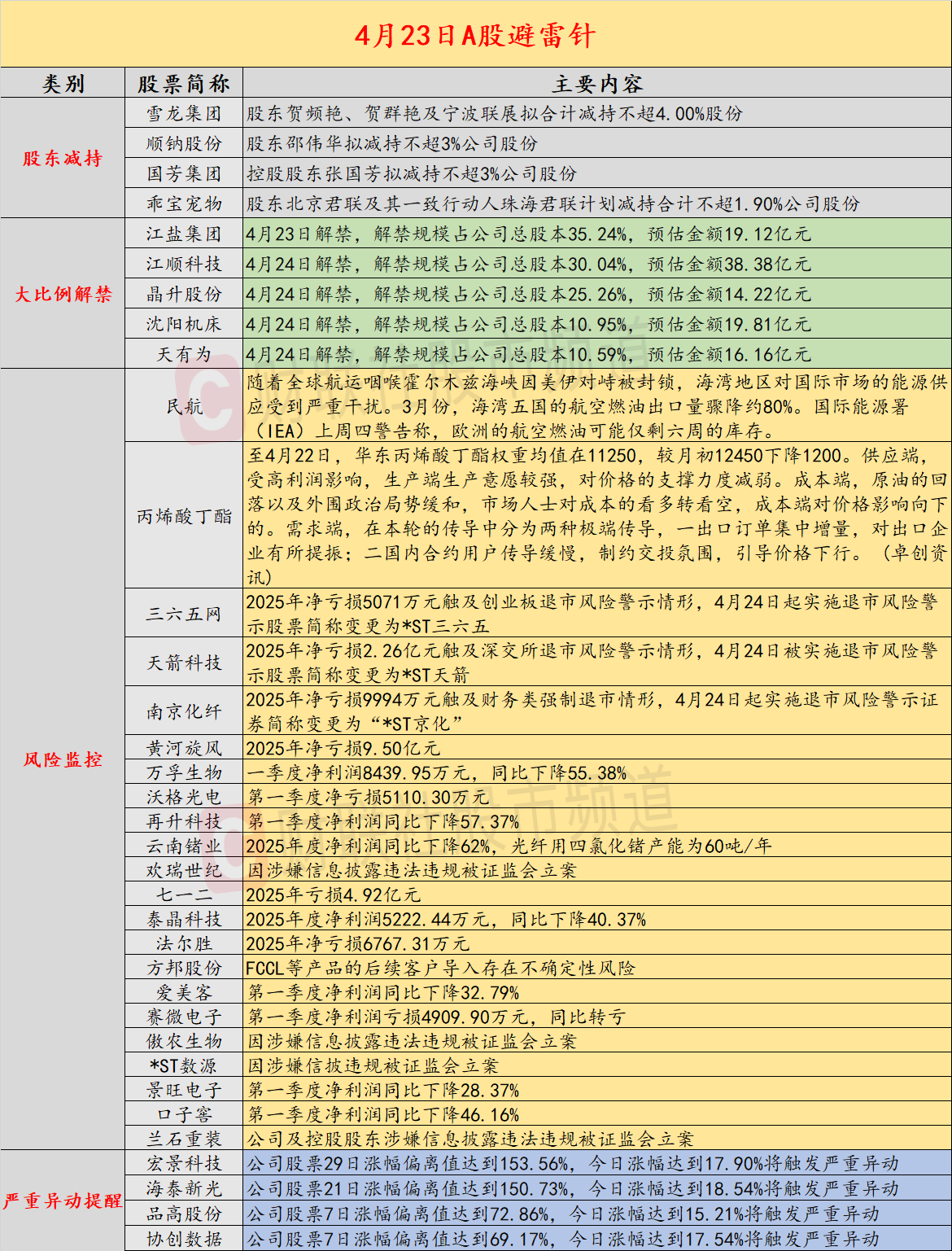 昨日公告的A股拟减持的公司数量较之前有所减少,雪龙集团股东贺频艳、贺群艳及宁波联展拟合计减持不超4.00%股份,顺钠股份股东邵伟华拟减持不超3%公司股份;江盐集团、江顺科技将迎来超三成以上解禁;公募总规模3月下降超万亿,中断11个月连涨趋势;10天6板沃格光电第一季度净亏损5110.30万元;丙烯酸丁酯降幅扩大;4天3板云南锗业2025年度净利润同比下降62%,光纤用四氯化锗产能为60吨/年;美军据称需6个月才能完成霍尔木兹海峡扫雷。