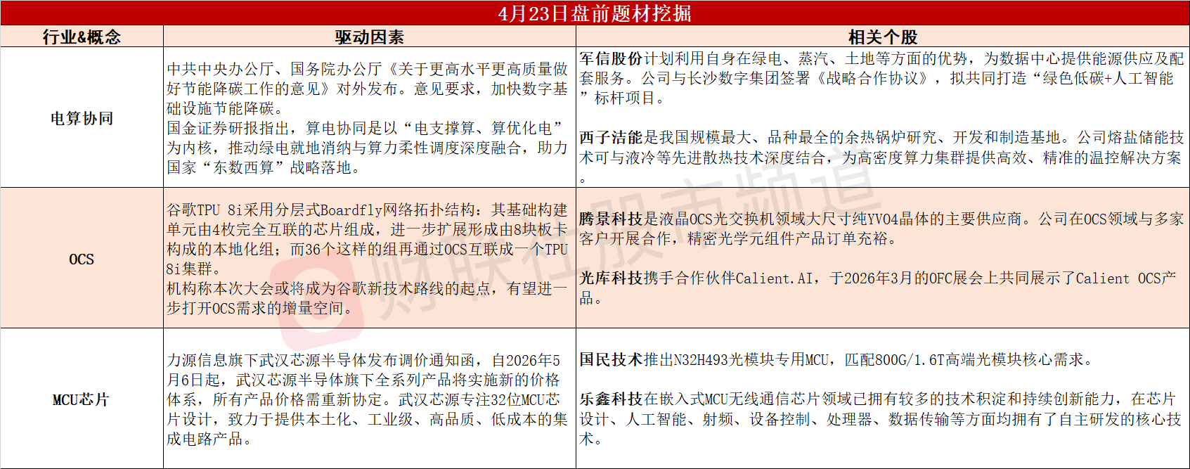①中办、国办推进算力设施节能降碳改造,绿色算力有望站上风口。②谷歌第八代TPU正式亮相,相关OCS需求有望爆发式增长。③武汉芯源半导体官宣全系产品调价,MCU芯片迎涨价潮。