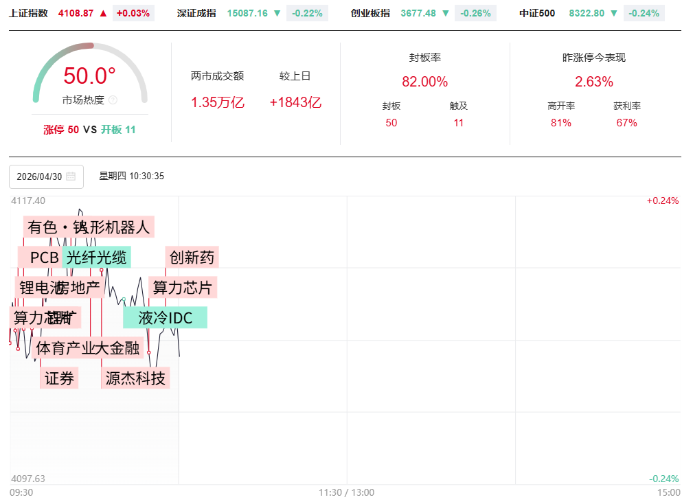 财联社4月28日电,市场全天震荡调整,三大指数低开低走,创业板指、深成指、科创50指数均跌超1%,创业板指日线走出4连阴。沪深两市成交额2.54万亿,较上一个交易日缩量531亿。盘面上,市场热点较为杂乱,全市场超3600只个股下跌。从板块来看,工业气体概念反复活跃,水发燃气7天6板,蜀道装备20CM涨停。绿电概念快速拉升,华电能源4连板,华银电力涨停,华电辽能触及涨停。医药板块表现活跃,药明康德、润都股份、汉森制药、津药药业涨停。算力租赁概念盘中走强,群兴玩具、三人行、利通电子涨停。算力芯片概念延续强势,综艺股份4天3板,仁东控股涨停。煤炭板块震荡走高,昊华能源4天2板。下跌方面,有色金属板块震荡走弱,南山铝业触及跌停,锡业股份、株冶集团、赤峰黄金等纷纷下挫。旅游酒店概念集体调整,陕西旅游跌停,天目湖、丽江股份、金陵饭店跌幅居前。截至收盘,沪指跌0.19%,深成指跌1.1%,创业板指跌1.43%。
